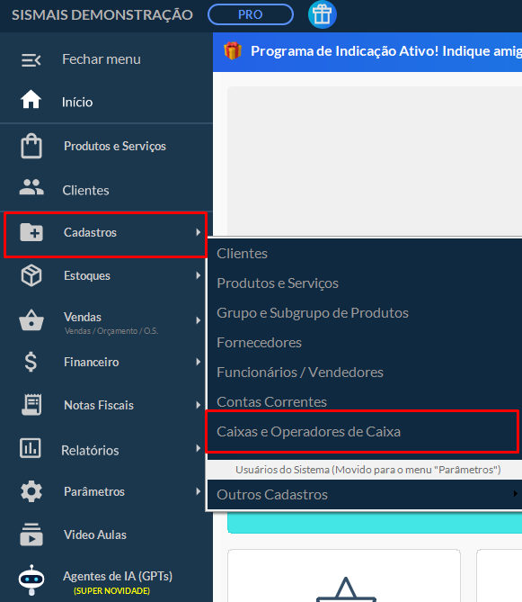 Em seguida, selecione Caixas / Operadores de Caixas.