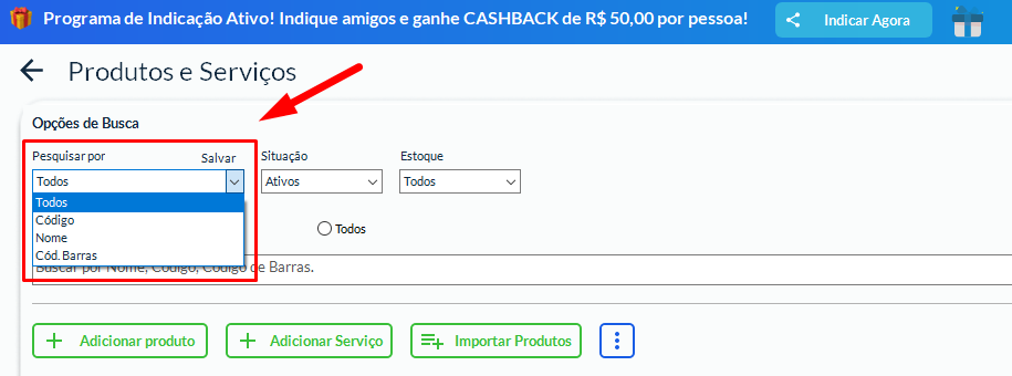 Embora serviços normalmente não utilizem controle de estoque, o filtro estará disponível com as opções: