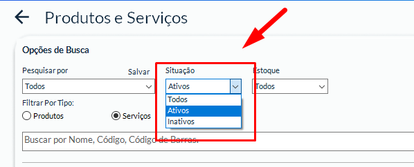 Caso não encontre o serviço, verifique se ele não está marcado como Inativo e altere o filtro de Situação para “Todos”.