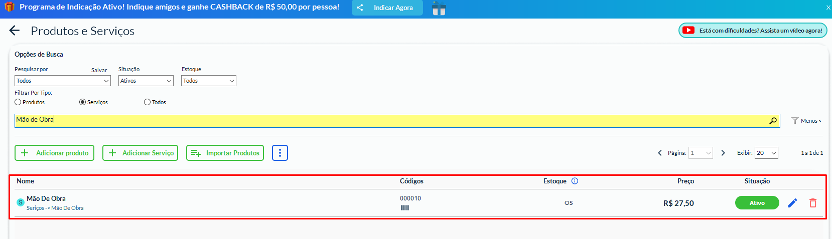 Você poderá editar (✏️), excluir (🗑️) ou visualizar as informações do serviço.