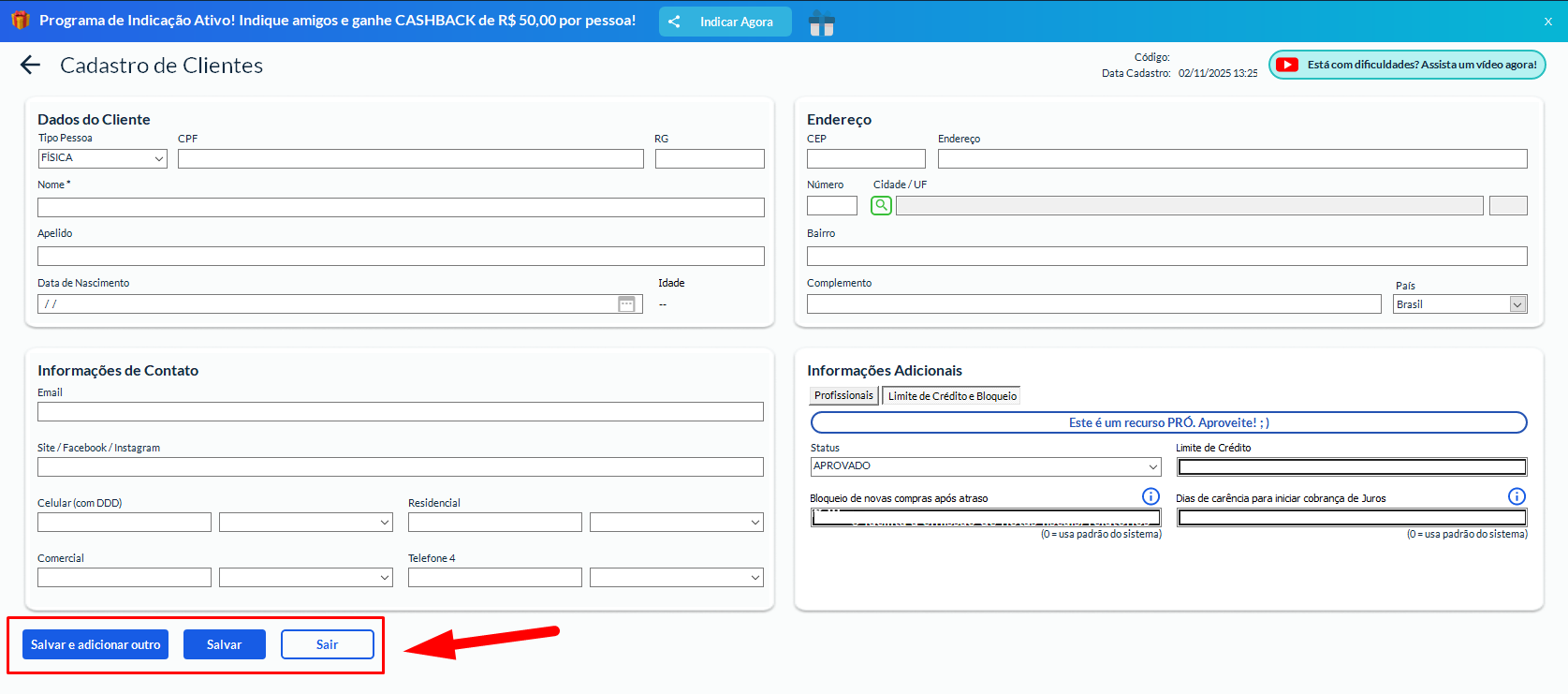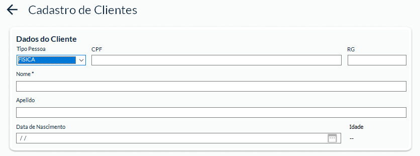 O sistema abrirá uma nova tela para preenchimento dos dados do cliente.