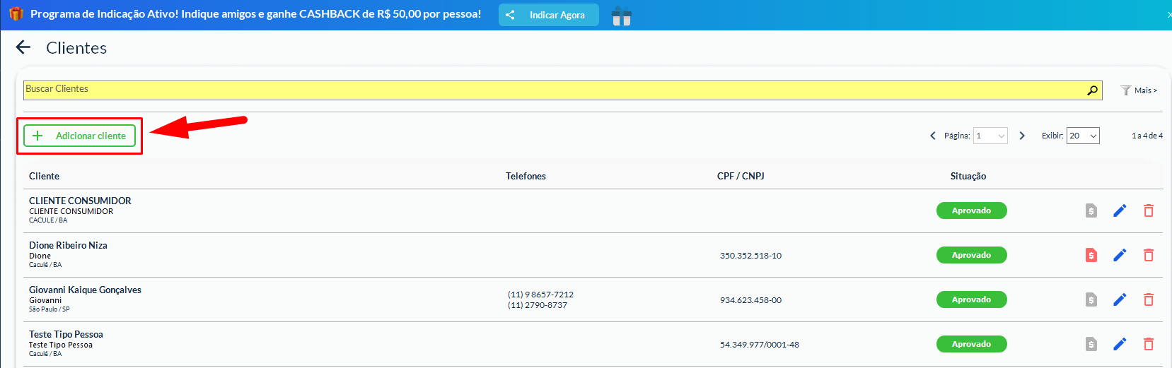 Na tela de Clientes, clique no botão “Adicionar cliente”.