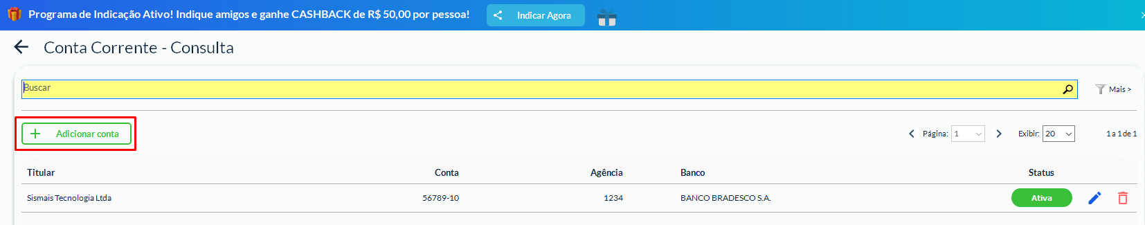 A nova conta será exibida automaticamente na tela de Consulta de Contas Correntes.