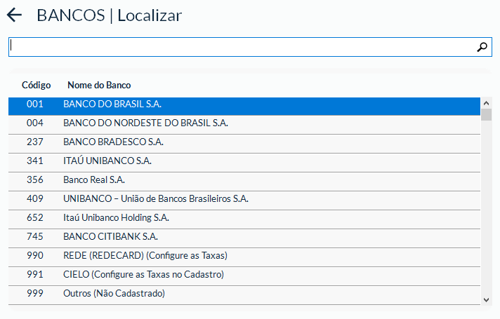 Ao clicar na lupa, será exibida a tela “BANCOS | Localizar”, contendo a lista dos principais bancos.