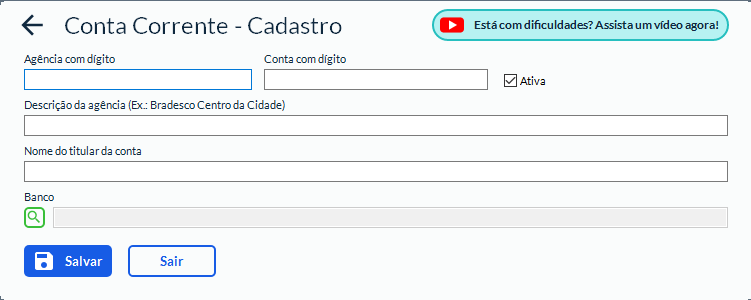 🏦 Contas inativas: desmarque a opção “Ativa” caso a conta bancária não seja mais utilizada.