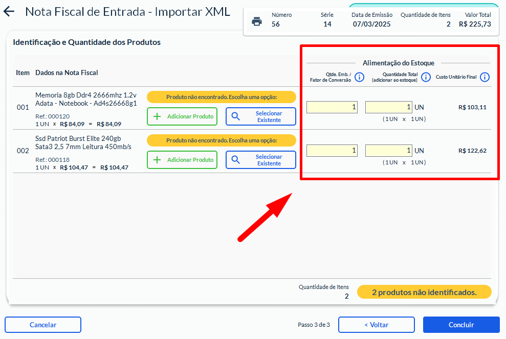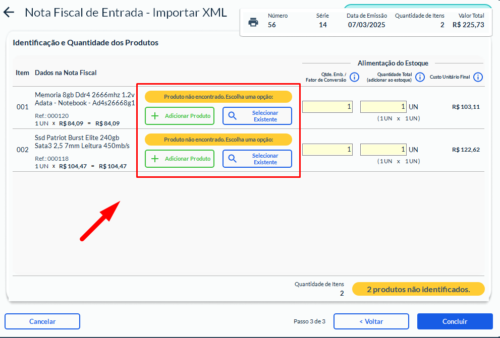 O sistema verificará se os produtos do XML já existem no cadastro.