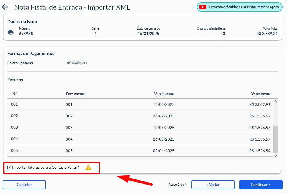 Marque a opção Importar faturas para o Contas a Pagar, se desejar gerar os títulos automaticamente.