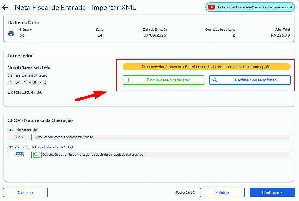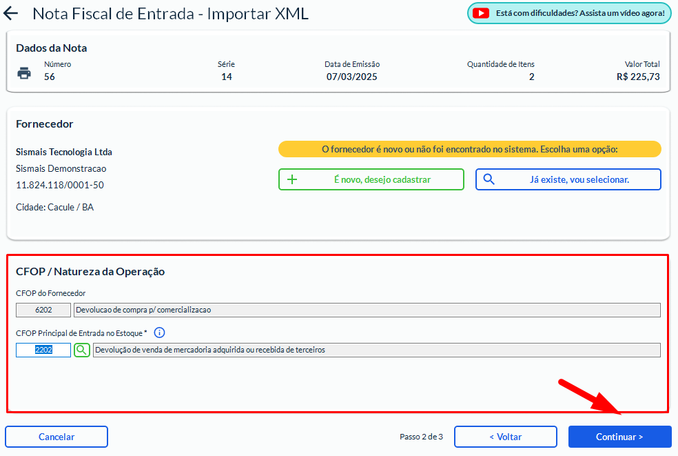 Revise as informações da nota (dados gerais, fornecedor, CFOP e configurações).