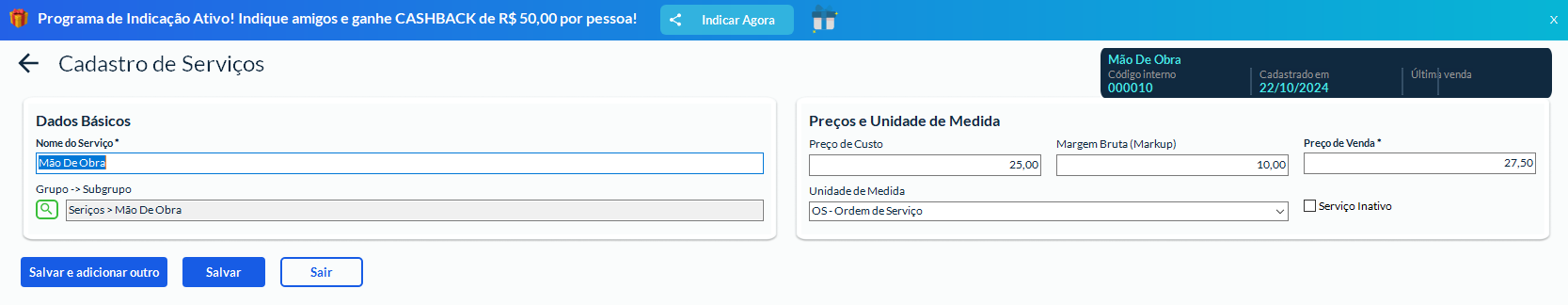 📌 Lembre-se: o Preço de Venda é obrigatório para que o serviço possa ser utilizado.