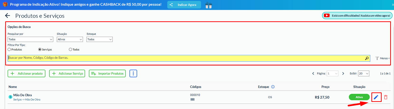 Após localizar o serviço desejado, clique sobre ele ou no ícone de editar (lápis).
