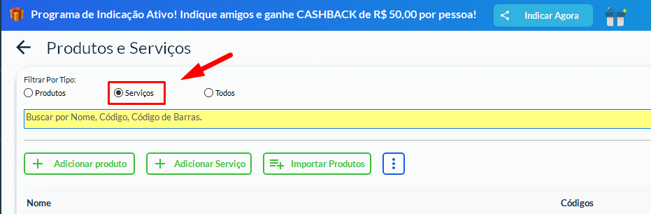 No filtro Filtrar por Tipo, marque a opção Serviços.