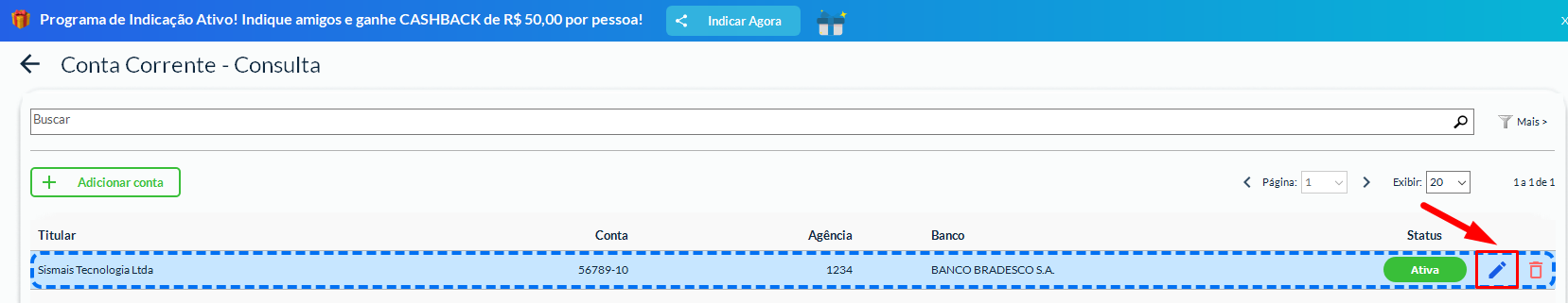 Na lista de contas, localize a conta desejada e clique no ícone do lápis azul ✏️ na coluna de ações.