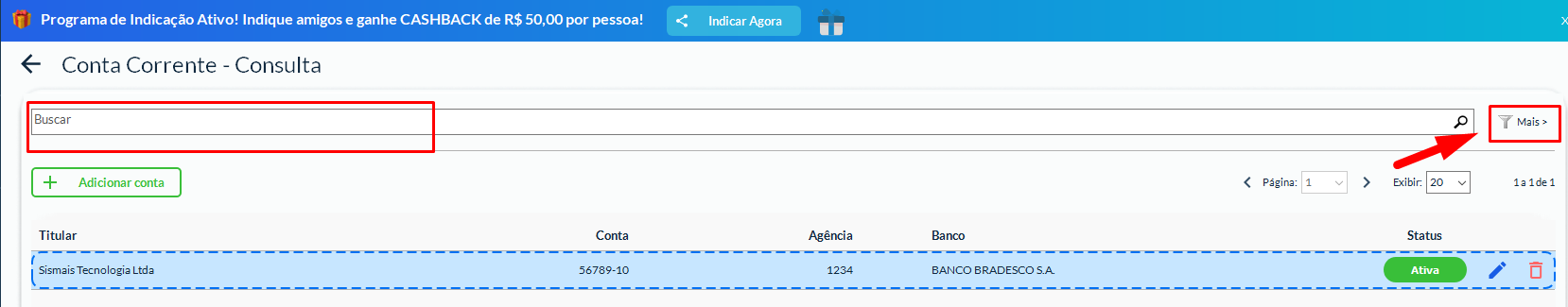 Após salvar, as novas informações serão atualizadas e exibidas na tela de Consulta de Contas Correntes.