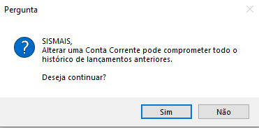 “Alterar uma Conta Corrente pode comprometer todo o histórico de lançamentos anteriores. Deseja continuar?”