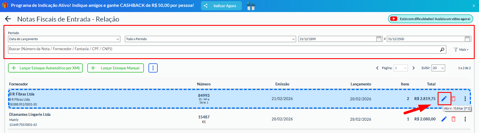Utilize os filtros (fornecedor, período ou número da nota).