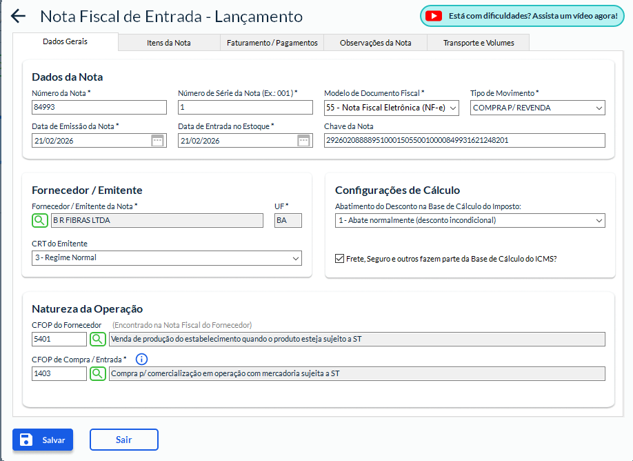 CFOP (se necessário ajuste fiscal interno)