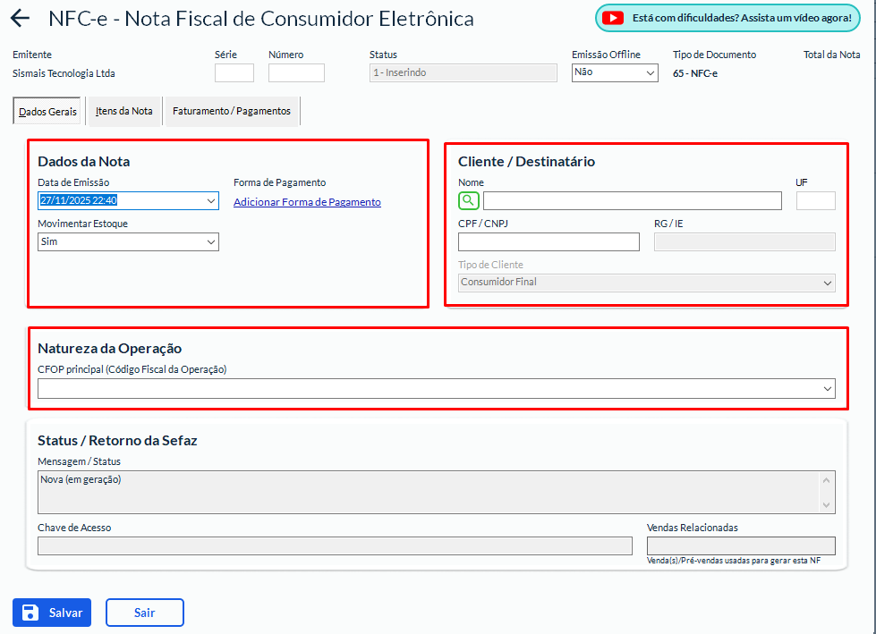 O sistema abrirá a tela de cadastro da nota, na aba Dados Gerais.