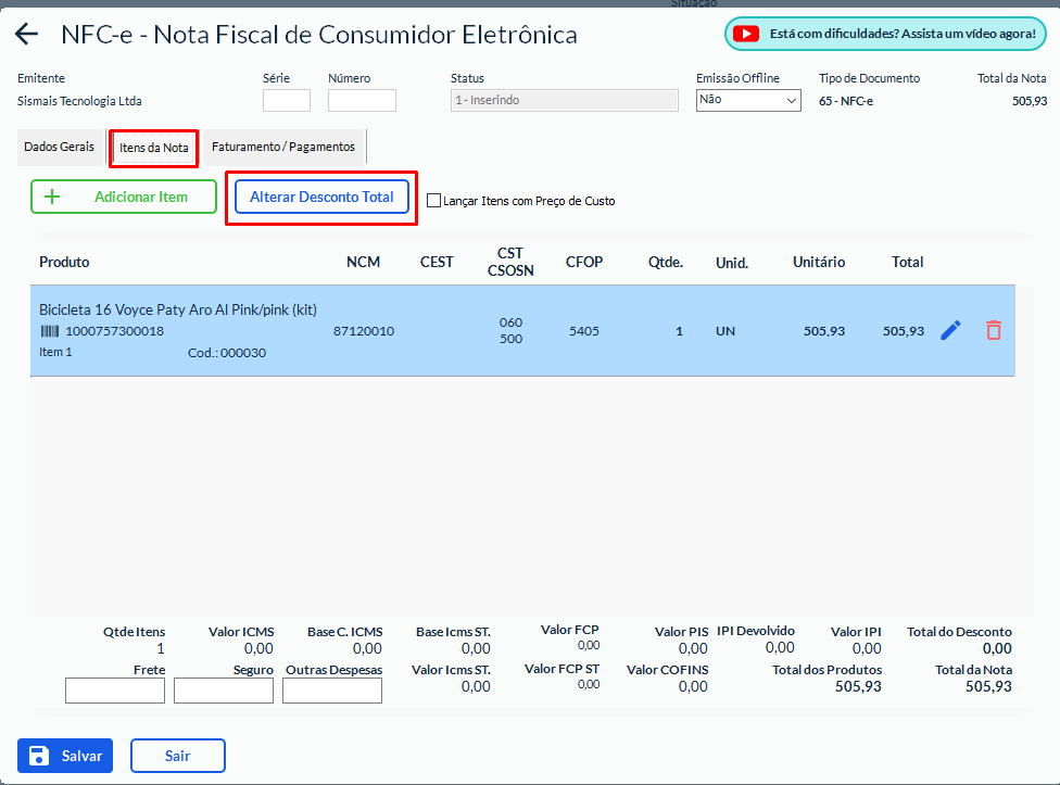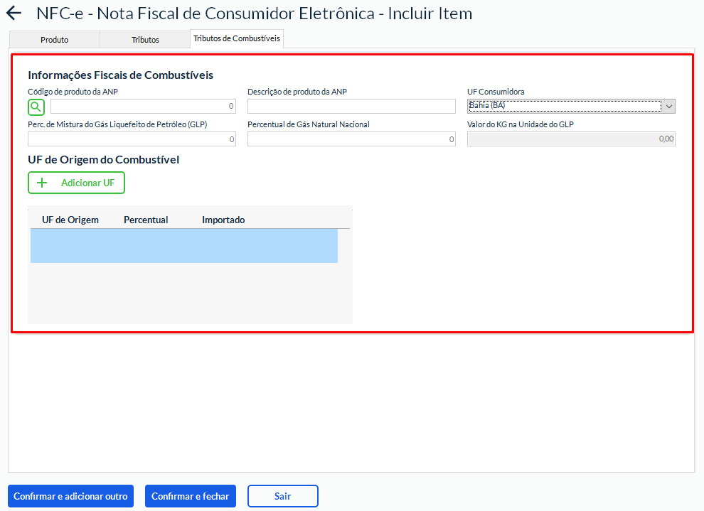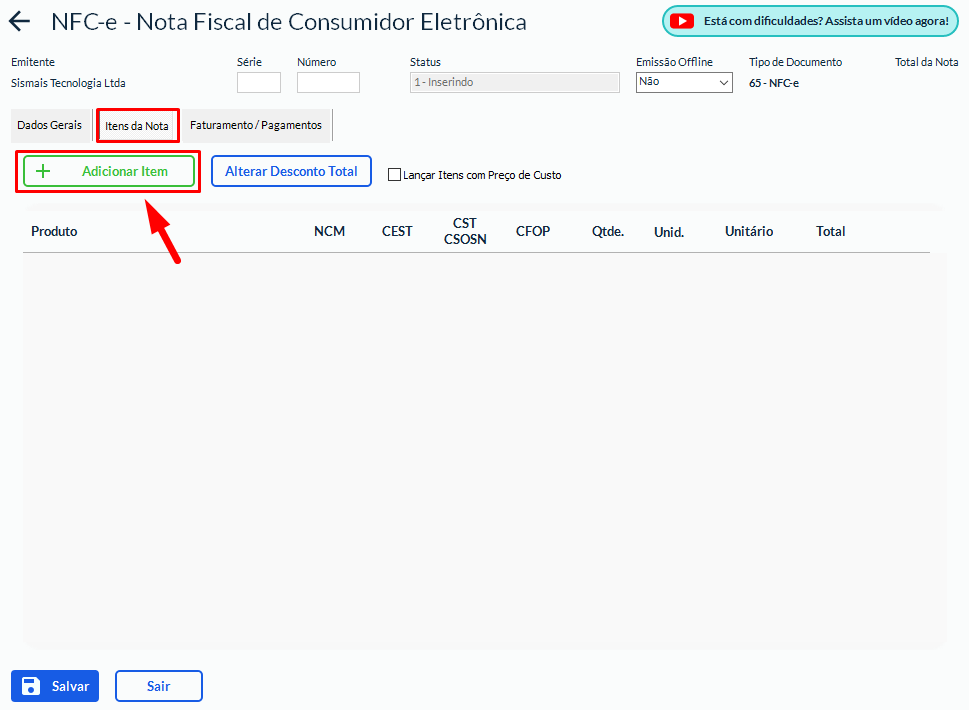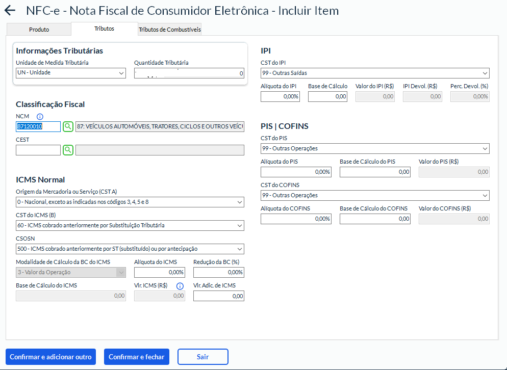 Em seguida, preencha os campos na tela NFC-e – Incluir Item: