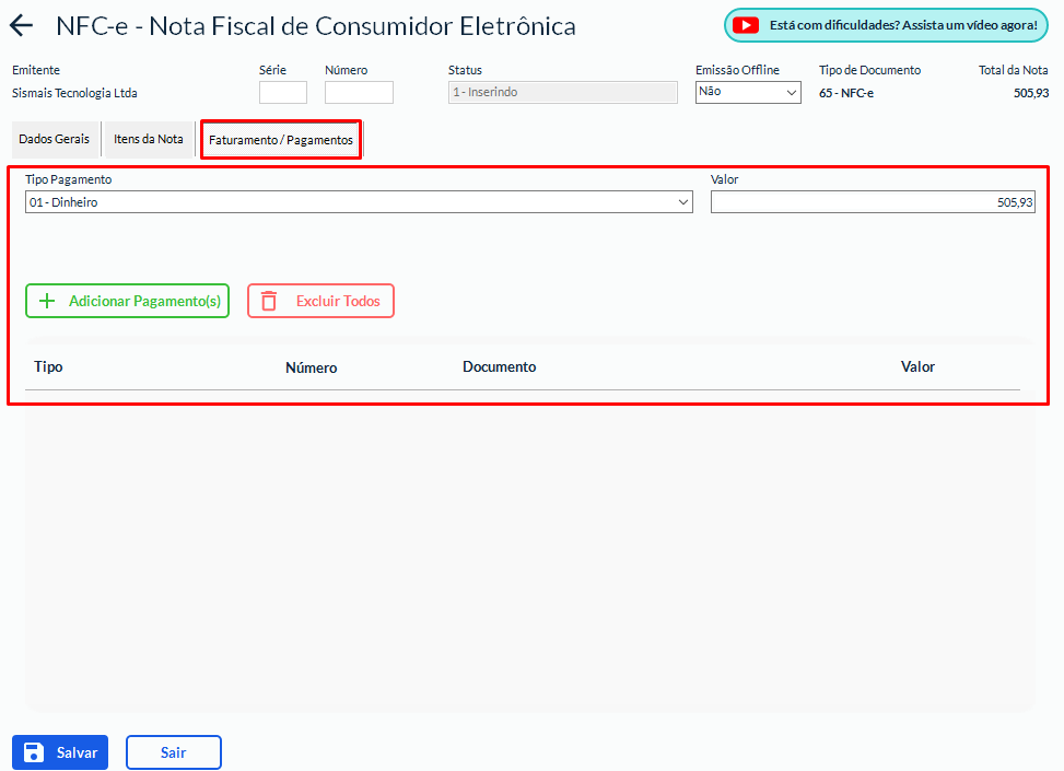 Forma de Pagamento: clique em “Adicionar Forma de Pagamento” e selecione o meio de pagamento utilizado.