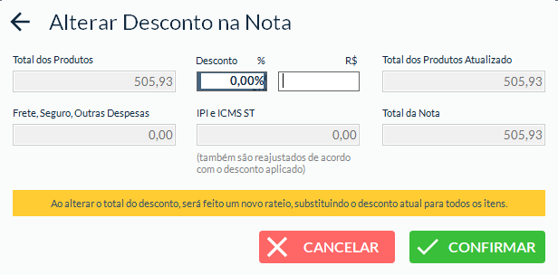 ⚠️ Atenção: ao alterar o desconto total, o sistema fará um rateio automático entre todos os itens, substituindo os descontos individuais existentes.