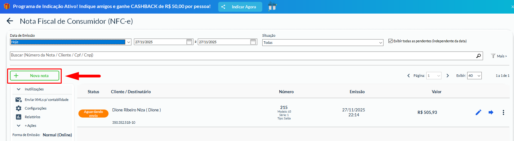 Você será direcionado para a tela principal de emissão da NFC-e, onde é possível visualizar, criar e gerenciar todas as notas fiscais de consumidor.