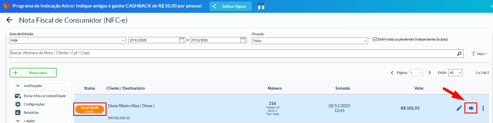 Clique no ícone de da setinha ➡️ para transmitir a nota à SEFAZ.