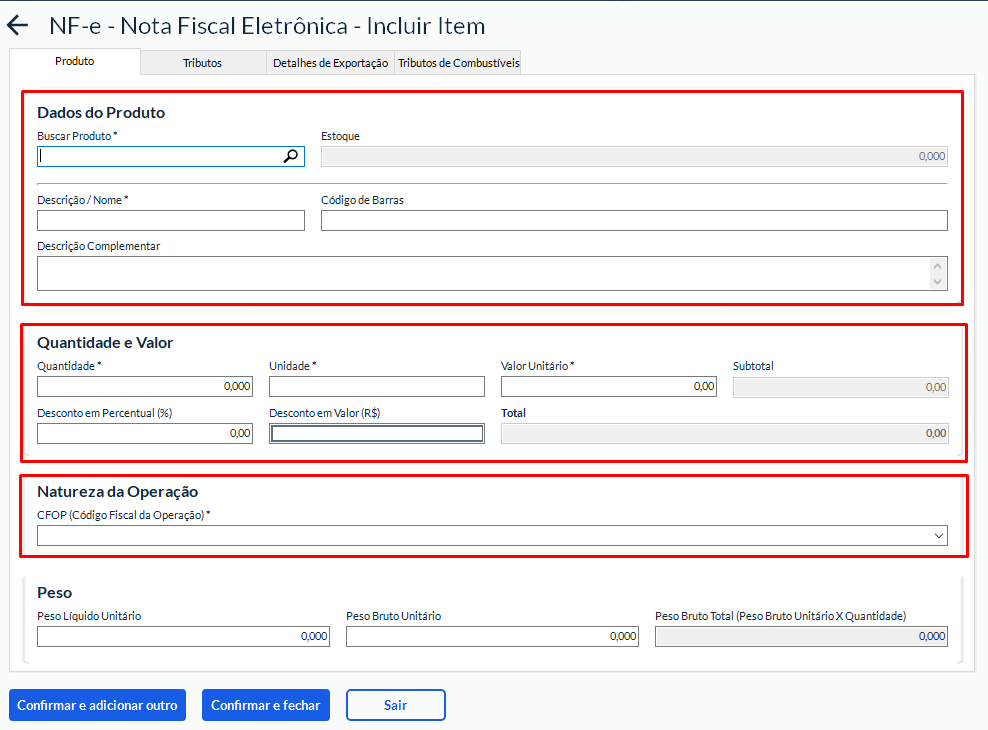 Essa aba é usada para inserir observações que serão impressas na NF-e, como mensagens ao cliente, observações de entrega, ou informações exigidas em alguns cenários.