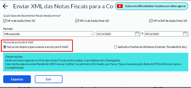 💾 Salvar em Arquivo: cria um arquivo ZIP com todos os XMLs para enviar manualmente à contabilidade.