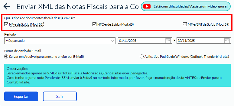 Na tela Enviar XML das Notas Fiscais para Contabilidade, selecione os tipos de documentos fiscais que deseja incluir: