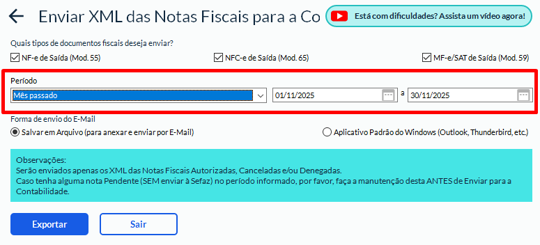 Em Período, escolha o intervalo das notas que deseja exportar: