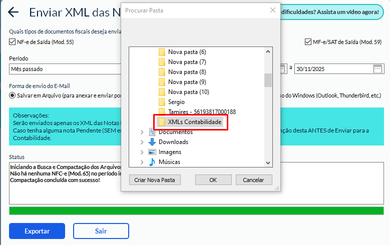 O sistema criará um arquivo compactado no formato ZIP, contendo todos os XMLs do período selecionado.
