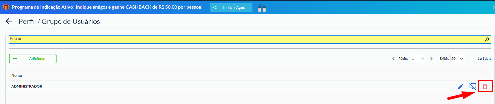 Na tela Perfil / Grupo de Usuários, use o campo de busca (em amarelo) para encontrar o perfil que deseja excluir.