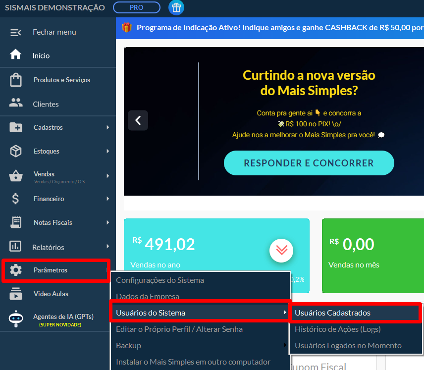 Em seguida, selecione a opção Usuário do Sistema → Usuário Cadastrados.