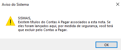 Se houver títulos vinculados no Contas a Pagar, o sistema exibirá um aviso.