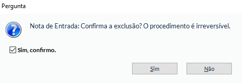 “Nota de Entrada: Confirma a exclusão? O procedimento é irreversível.”