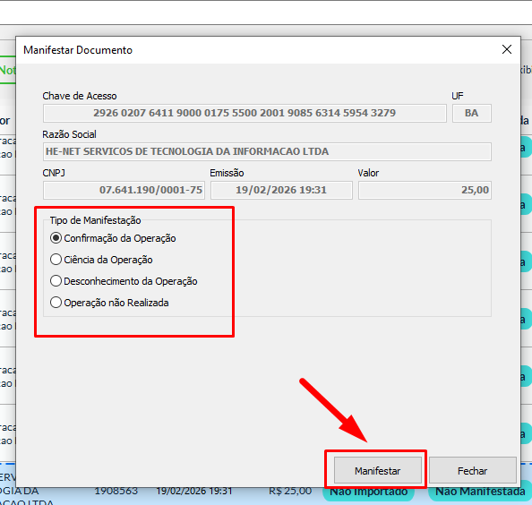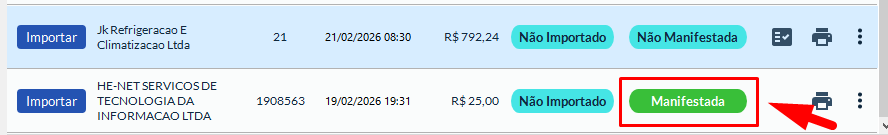 Ao lado da nota desejada, utilize os ícones de ação para manifestar o documento.