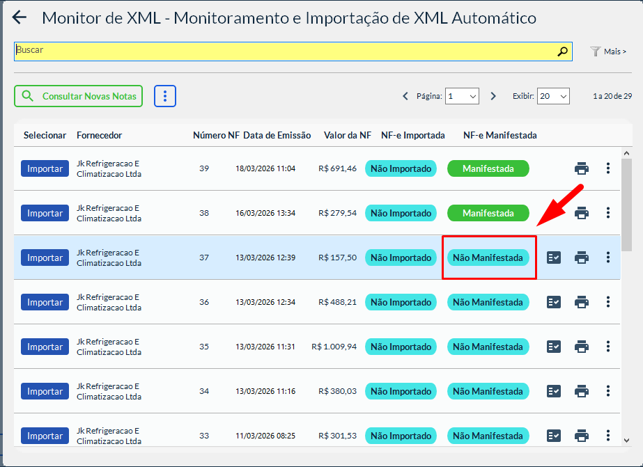 No Monitor de XML, é possível identificar facilmente se uma nota fiscal ainda não foi manifestada pelo destinatário.