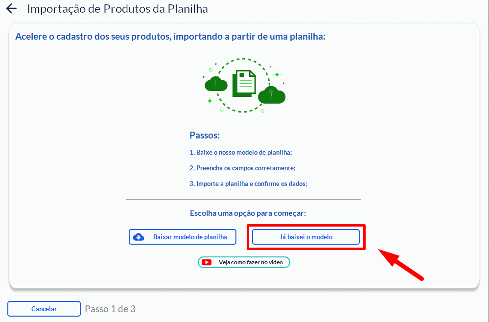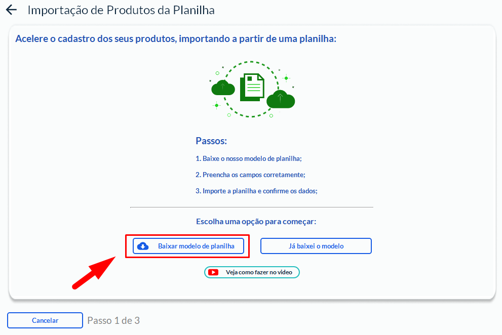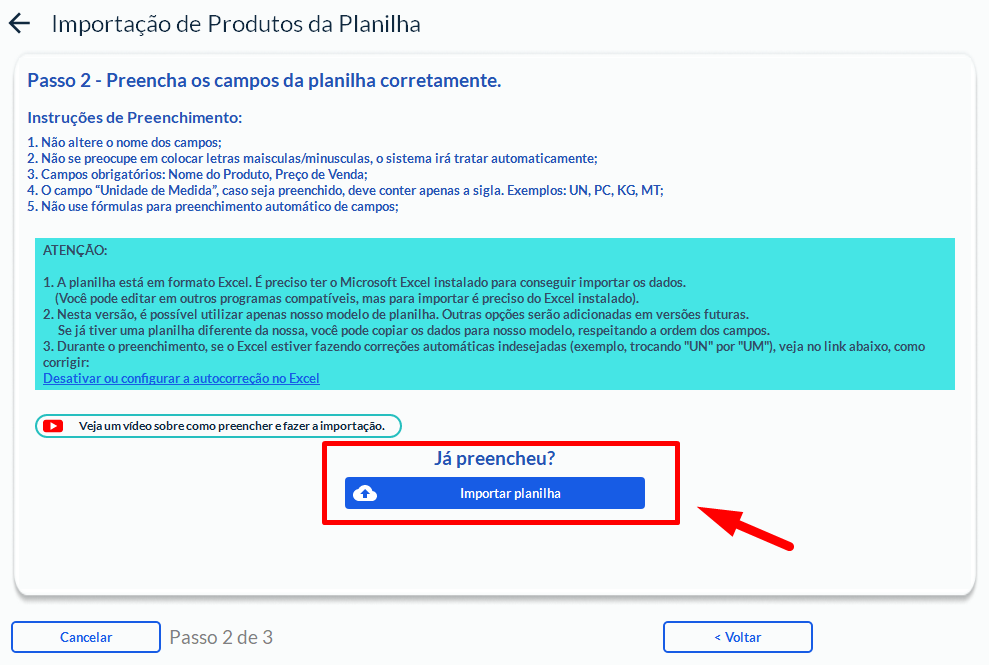 ➡️ Utilize exclusivamente o modelo disponibilizado pelo sistema para preencher os dados dos produtos.