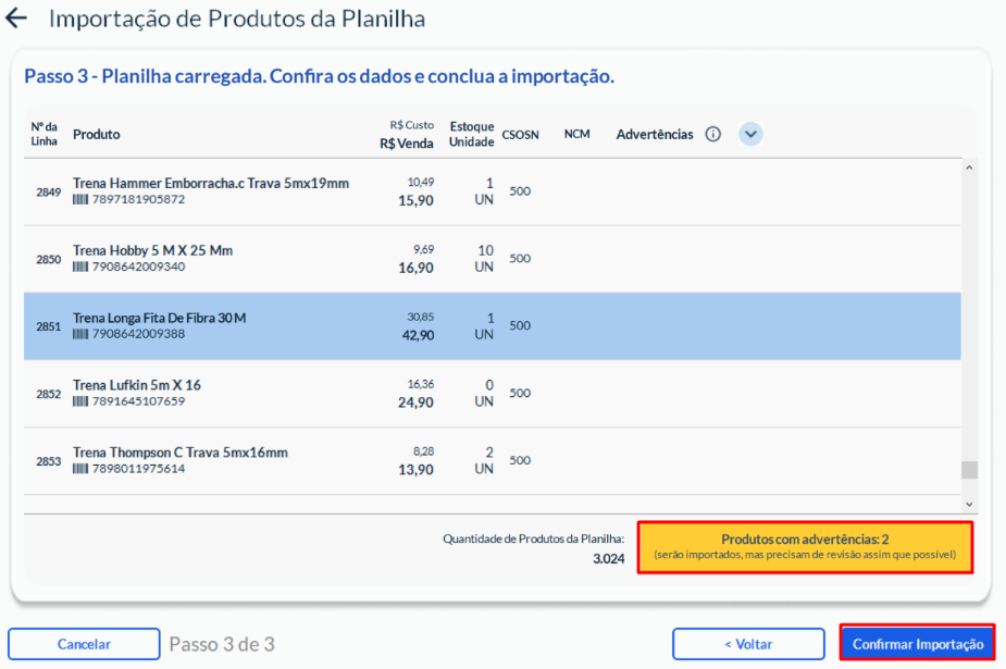 Prosseguir com a importação (os produtos serão importados, mas deverão ser revisados posteriormente);