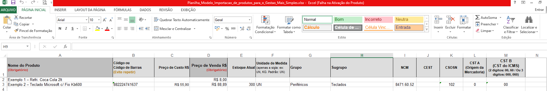 Qualquer alteração na estrutura da planilha pode impedir a importação correta dos produtos.