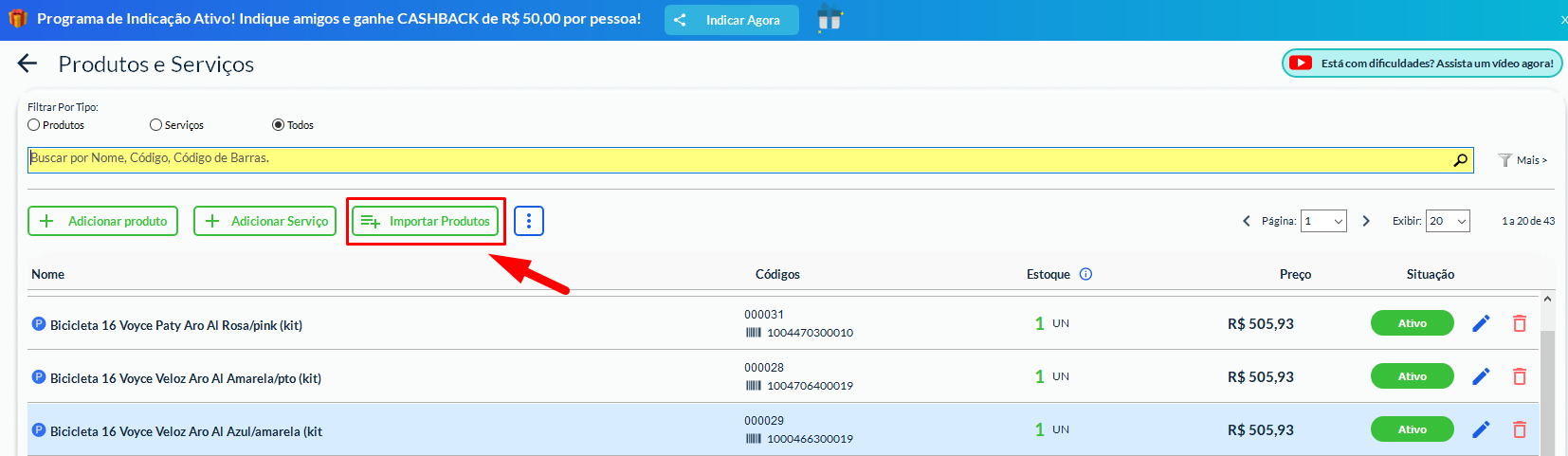 Os produtos já estarão disponíveis na listagem de Produtos e Serviços.