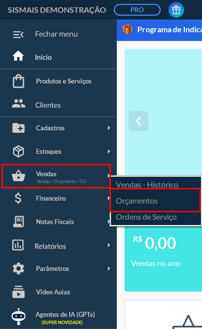 ? Como visualizar um orçamento no Gestão Mais Simples? Veja os detalhes completos de um orçamento sem alterá-lo: itens, dados do cliente e simulação de pagamentos. ? Acesso ao menu No menu principal do sistema, clique em Vendas. Em seguida, clique ...