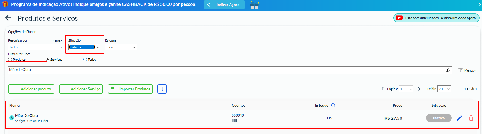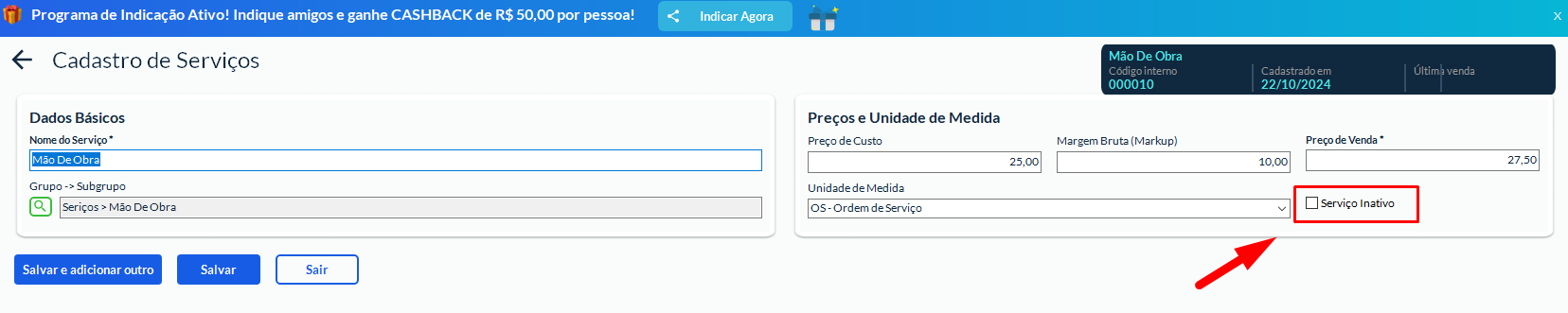 Ao inativar, o serviço deixa de aparecer nas buscas para novas vendas, mas permanece registrado no sistema.