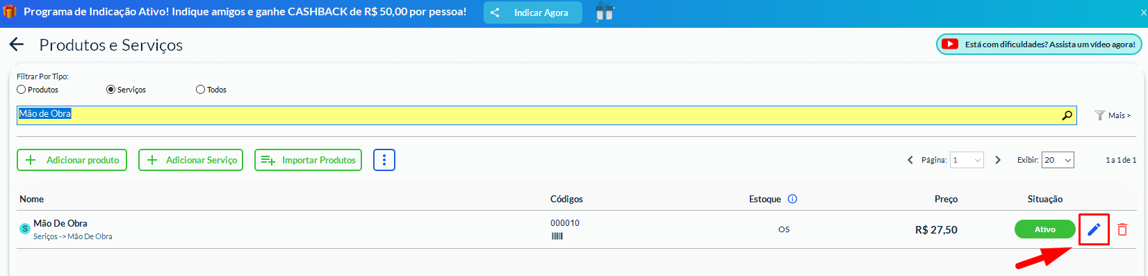 Clique no serviço desejado ou no ícone de editar (lápis).