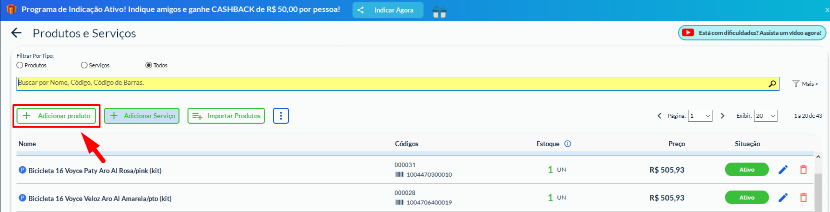 Clique no botão Adicionar Produto.