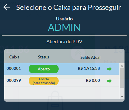 Se houver mensagem de data atrasada, apenas selecione o caixa com saldo ou o caixa desejado.