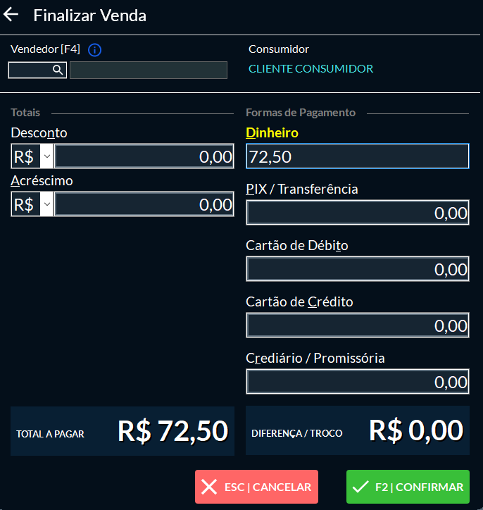 A diferença aparece automaticamente como troco.