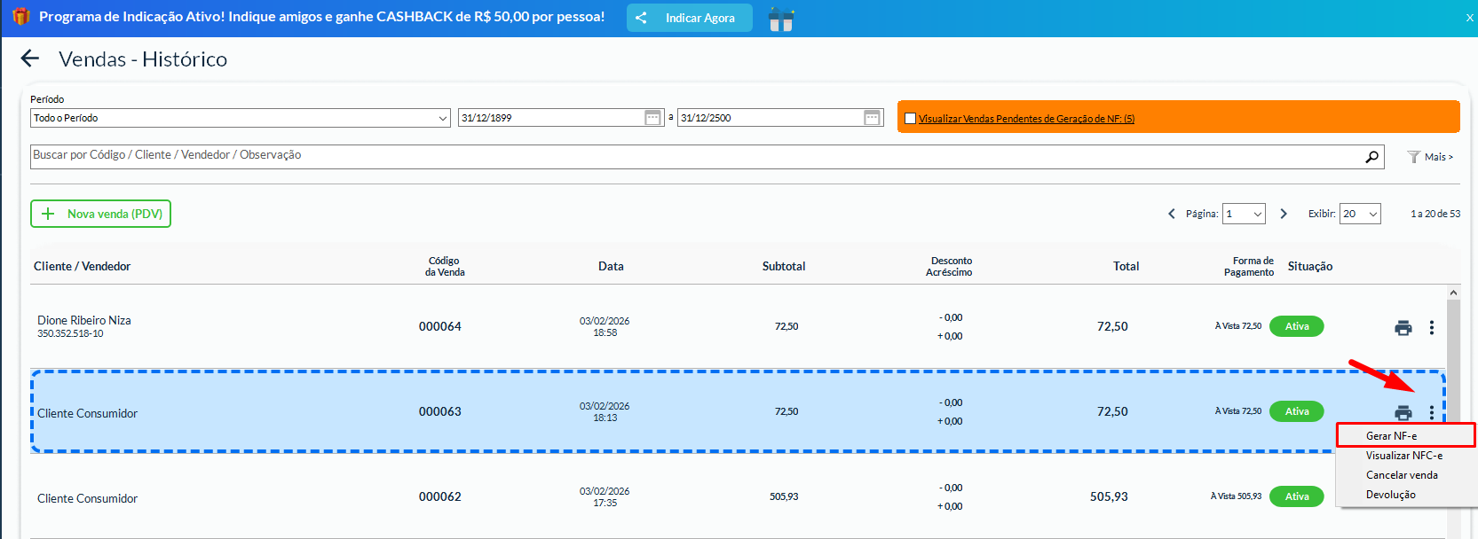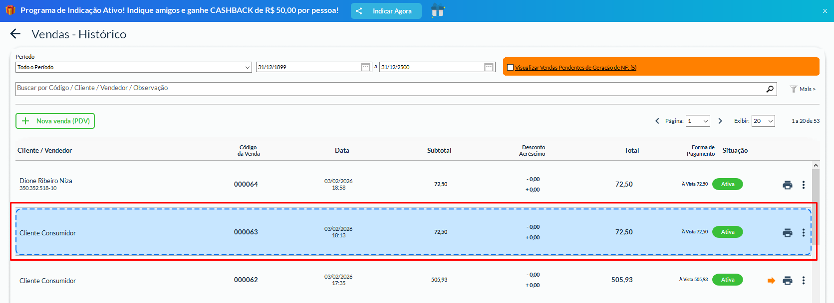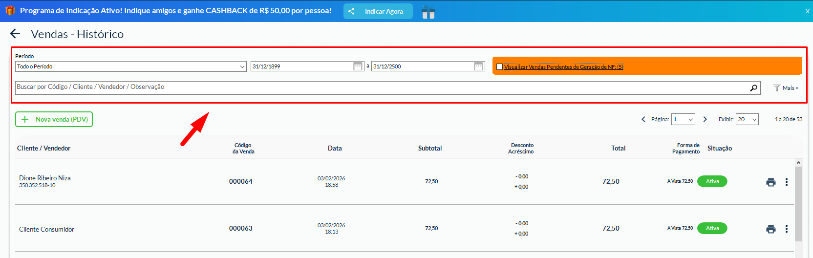Na tela de Histórico de Vendas, você pode usar filtros como: