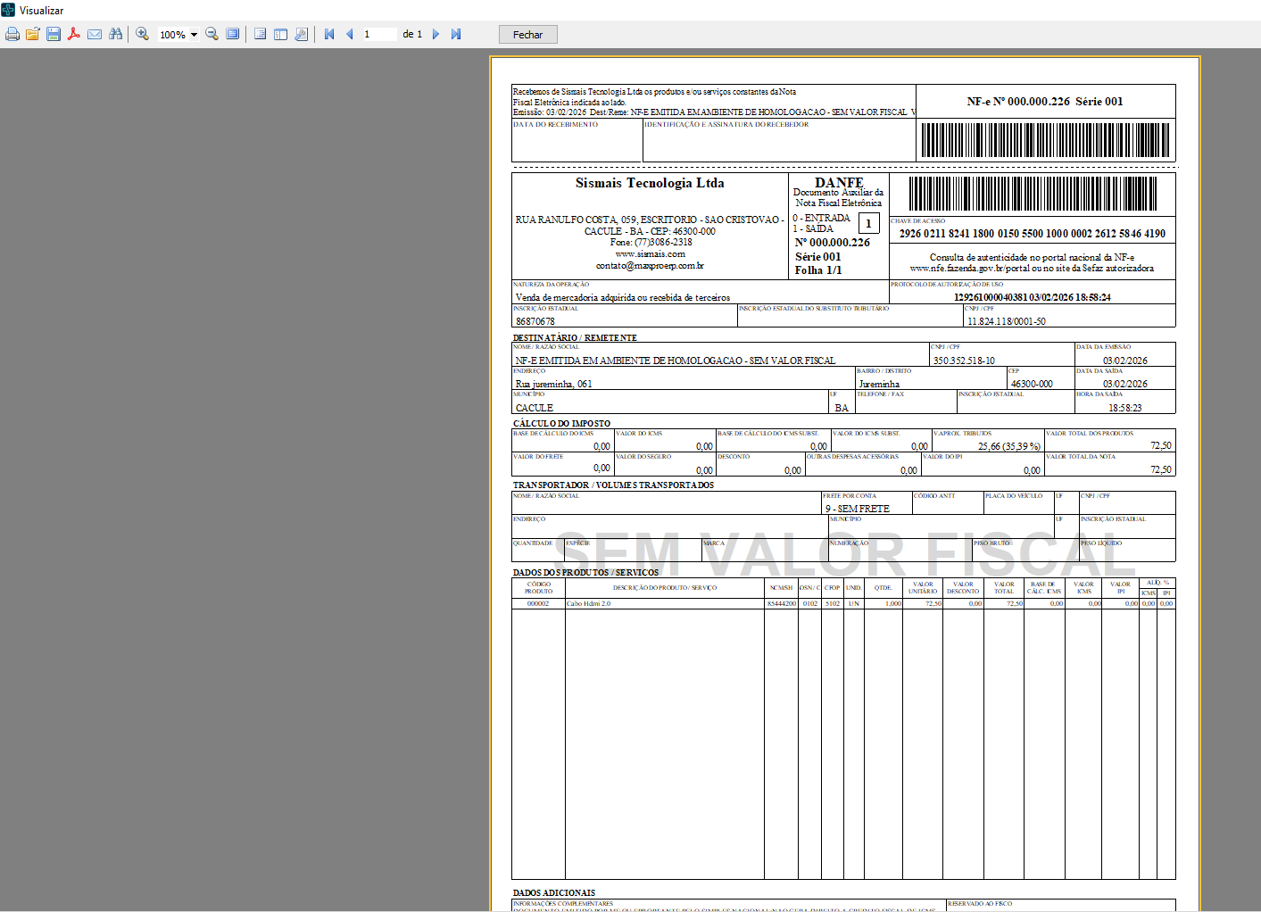 Após a emissão, a DANFE (Documento Auxiliar da Nota Fiscal Eletrônica) será exibida com: