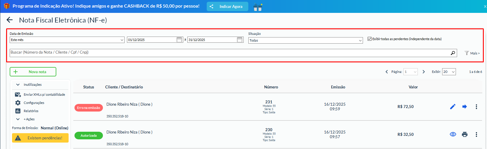 Filtrar por período e por situação/status ajuda a encontrar a nota mais rápido.